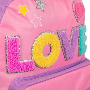 Mochila com bolsos laterias em tela com elástico, tag identificador, painel frontal em cetim, pés de apoio, alça de mão e etiquetas personalizadas.