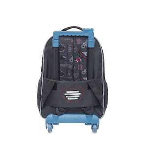 Mochila de rodinhas Tigor T Tigre com alças de costas, que conta com estampa frontal, bolso frontal, telinha lateral, compartimento grande com fechamento em zíper e etiquetas personalizadas.