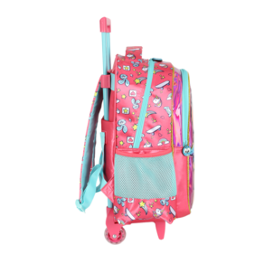 Design exclusivo Turma da Mônica: estampa vibrante com a Mônica e seu inseparável Sansão em destaque. Rodinhas resistentes: facilitam o transporte, proporcionando conforto no dia a dia escolar. Alça retrátil: prática e ajustável para puxar com facilidade. Alças acolchoadas: opção de uso como mochila de costas. Compartimento principal espaçoso: ideal para cadernos, livros e pastas. Bolsos laterais em tela: perfeitos para garrafinhas e pequenos objetos. Bolso frontal com zíper: maior organização e acesso rápido. Material resistente e de fácil limpeza.