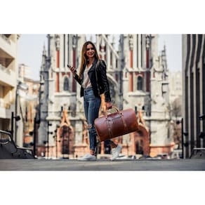 Dimensões: 20" (comprimento) x 11" (altura) x 9" (profundidade). Feita de couro de búfalo 100% genuíno, nossa mochila de viagem é bem espaçosa e tem muitos compartimentos, incluindo um compartimento separado para sapatos. Do lado de fora, tem bolsos com zíper em cada lado da bolsa e um compartimento para sapatos e, do lado de dentro, um bolso com zíper para seus gadgets, revistas ou livros, um pequeno bolso para seu telefone, dinheiro e chaves, porta-canetas e vários compartimentos para cartões. Possui pinos de metal na parte inferior para evitar escorregões e protege a parte inferior da bolsa contra arranhões. Nossa mochila tem duas alças de transporte grandes na parte superior e uma alça ajustável para lhe dar apoio durante a viagem. Esfregado com óleo vegetal para obter um acabamento suave e uma aparência natural, você receberá elogios onde quer que vá devido ao seu atraente design de pinceladas. Perfeito para a academia, uma escapadela de fim de semana e uma curta viagem de negócios. Também é ótimo para viagens aéreas como bagagem de mão, bagagem de mão ou bolsa embaixo do assento.