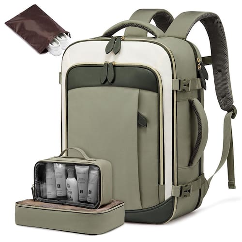 LOVEVOOK Mochila de viagem para mulheres e homens, mochila de mão aprovada por companhias aéreas, H-pea verde-bege-verde, Moderno - Capacidade expansiva de 40 L para viagens organizadas – viaje com tudo o que você precisa viajar por 3 a 5 dias, organizado perfeitamente nesta mochila versátil. Seu compartimento principal estilo bagagem, seção separada para laptop e bolso frontal com zíper com vários bolsos oferecem conveniência incomparável - Leve e resistente – Feita de materiais resistentes a rasgos e resistentes à água, esta mochila de viagem feminina pesa apenas 1 kg. Complementada por artesanato requintado e pontos de desconforto reforçados. Esta mochila resiste aos rigores da viagem - Viagem aérea sem esforço – Deslize pelos aeroportos com facilidade! Esta bolsa de mão, com tamanho de 45,7 x 35,5 x 20,3 cm, se alinha com a maioria dos requisitos de bagagem de viagem de itens pessoais de companhias aéreas. O design de abertura de 180 graus para compartimentos acelera as verificações de segurança, tornando sua experiência no aeroporto tão suave quanto suas viagens - Focada no conforto e proteção – Desfrute de conforto ergonômico com alças acolchoadas e uma malha respirável nas costas. A mochila também possui um compartimento de laptop acolchoado com espuma para segurança extra de seus eletrônicos. Com um bolso molhado exclusivo, pode colocar toalhas molhadas ou roupas suadas - Segurança e conveniência – Viaje com tranquilidade graças a um bolso antirroubo e uma alça de bagagem. Com uma porta de carregamento USB (o power bank não está incluído) e um cabo de dados embutido, mantenha seus dispositivos ligados em movimento - Extras para tranquilidade – Completo com 2 organizadores e uma bolsa de sapatos para uma organização ideal. SERVIÇO PERFEITO - Nossos vendedores dão muita importância à experiência de compra de nossos clientes. Qualquer dúvida, sinta-se à vontade para entrar em contato conosco. A mochila LOVEVOOK fornecerá atendimento ao cliente 12 horas