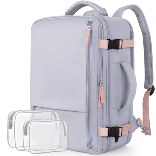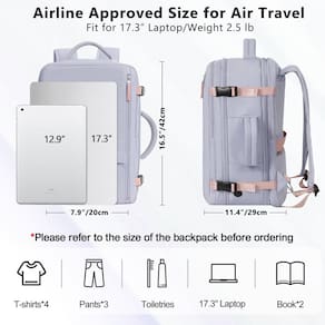 Características da mochila Snoffic para laptop de viagem. 1. O bolso para garrafa de água é projetado para garrafa de água ou guarda-chuva, etc. 2. O compartimento para laptop é adequado para laptop de 17,3 polegadas ou tablet de 12,9 polegadas, e o acolchoamento espesso protege os produtos eletrônicos contra impactos. 3. A separação úmida e seca. Armazenamento de divisória de suprimentos de viagem mais organizado; 4. A porta de carregamento é projetada para carregar celulares/tablets em qualquer lugar, a qualquer hora; 5. Você pode colocar a mochila na mala para liberar suas mãos e costas devido às alças de bagagem da mochila; 6. O bolso antirroubo na parte de trás da mochila para evitar a perda de objetos de valor como celular, cartão de identidade ou passaporte enquanto estiver na fila ou caminhando; Embalagem: mochila de viagem grande + 2 bolsas de higiene pessoal Cor: preto / rosa / bege / cinza e roxo / azul e verde Material: poliéster Tamanho: 16,5 x 11,4 x 7,8 polegadas (42 x 29 x 20 cm) Peso: 2,5 lbs (1,15 kg. Este item não se destina a ser utilizado por crianças a partir de 3 anos. - Compartimento acolchoado para laptop e grande capacidade: a mochila acolchoada para laptop de 39.6 cm comporta bem como notebook/laptop de 15 polegadas, 14 polegadas e 13 polegadas. laptop e também protege produtos eletrônicos contra impactos. Além disso, a mochila tem uma grande capacidade, um compartimento seco e molhado e vários bolsos, então nossa mochila de viagem para laptop pode organizar sua viagem - Orifício de carregamento e design antifurto: nossa mochila de mão tem design de orifício de carregamento que permite a passagem do cabo de dados, para que você possa carregar seu telefone enquanto caminha. Além disso, o bolso antirroubo na parte de trás da mochila de viagem para mulheres e homens permite que você coloque telefone, passaporte ou carteira nela. Tornando sua viagem e viagem mais convenientes onde quer que você vá - Mochila de item pessoal: Snoffic mochila de viagem aprovada em voo é de 43 x 30 x 20 cm (C x L x P) e pesa 1,14 kg. Atende aos requisitos de itens pessoais das companhias aéreas. Se você não quiser carregá-la nas costas, você pode guardar as alças da mochila e é uma mala compacta - 2 bolsas de higiene complementares: a embalagem vem com duas bolsas transparentes à prova d'água, medindo 20,5 x 15 x 6 cm e 17 x 12 x 6 cm. A bolsa transparente armazena os artigos de lavagem de forma organizada e limpa e tem as vantagens de conveniência - Material superior e excelente tecnologia: nossa mochila de viagem é feita de tecido composto de sarja top 290. Existem 148 procedimentos envolvidos na fabricação para garantir a qualidade. A mochila é à prova d'água e evita que seus itens fiquem molhados