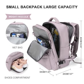 Mochila de viagem - Bolso seco e molhado - Porta de carregamento USB - Compartimento para sapatos - ?Mochila de mão aprovada por voo? Dimensões externas: 43 cm * 30 cm * 20 cm /16,93" * 11,81" * 7,87"; Peso: 1 kg / 1 kg. A mochila de viagem atende aos requisitos de bagagem de mão de muitas companhias aéreas. A mochila de ar pode ser colocada sob o assento do avião ou acima da cabeça, o que economiza suas cargas de bagagem de mão. Observação: verifique com sua companhia aérea as restrições de tamanho antes de sua viagem. - ?Design de bolso multifuncional?A mochila de grande capacidade tem 2 bolsos principais, 2 compartimentos para laptop, 1 compartimento para sapatos, 1 bolso frontal, 1 bolso lateral, 1 bolso traseiro antirroubo e outro bolso pequeno para suas várias necessidades de uso diário em qualquer lugar para viagens casuais de fim de semana. - ?Design de porta de carregamento USB?A mochila para laptop com uma porta de carregamento USB facilita carregar seu telefone ou outros dispositivos enquanto viaja - Compartimento para sapatos e bolso úmido: esta mochila de mão tem um compartimento separado para sapatos que pode transportar melhor seus sapatos e não cheira mal com orifícios de ventilação. A bolsa úmida é feita de material impermeável de alta densidade, que pode ajudá-lo a separar coisas secas das molhadas e, se você tiver roupas ou toalhas molhadas, pode colocá-las na bolsa úmida. - ?Alças de ombro respiráveis e almofada traseira?Esta mochila feminina é capaz de se ajustar às suas costas e ombros com uma esponja macia e respirável para uma longa viagem. O design de fivela fixa no peito facilita o ajuste e a fixação da mochila para aliviar a pressão nos ombros e nas costas.