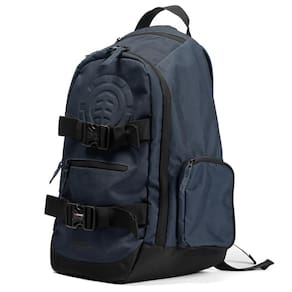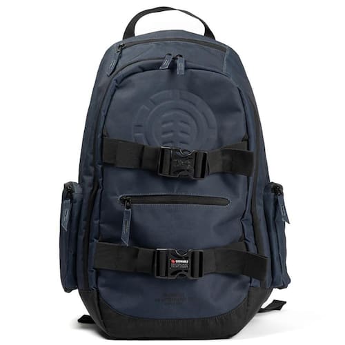 Mochila Element com 1 compartimento principal, 1 frontal, 2 bolsos laterais com zíper, 1 bolso superior para óculos de sol e 1 bolso acolchoado para laptop com fita dupla aderente. Alças de skate dianterias removíveis, logotipo da árvore em relevo frontal, forro e revestimento externo de poliéster reciclado e etiquetas personalizadas.