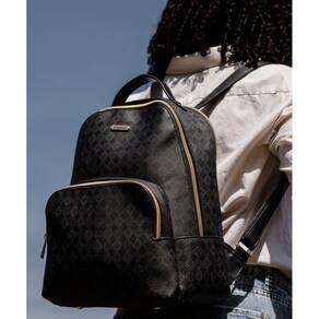 Mochila feminina com estampa exclusiva de elementos gráficos em padrão geométrico, trazendo um visual moderno e elegante para o dia a dia.