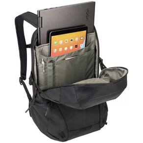 Descrição: Os bolsos elevados dedicados protegem um laptop de até 15,6 polegadas e um tablet de até 10,5 polegadas Um espaçoso bolso em tecido de malha com zíper estica para adicionar volume e armazenar acessórios eletrônicos e outros itens pessoais O bolso lateral externo em tecido de malha permite armazenar facilmente uma garrafa d'água O bolso externo com zíper permite acessar facilmente seus itens onde quer que você esteja Pontos de fixação no painel frontal permitem que você conecte facilmente equipamentos extras Um painel vazado permite que você conecte a mochila à mala com rodinhas para facilitar sua viagem A tira para peito, o painel traseiro acolchoado com canal de fluxo de ar e as fitas de compressão laterais para equilibrar a carga tornam o transporte mais confortável Bolsos internos dedicados facilitam armazenar pequenos acessórios e canetas Produzida com nylon 400D com aprovação bluesign e zíperes YKK