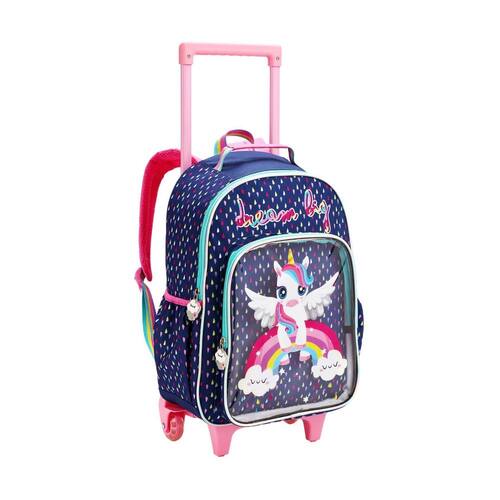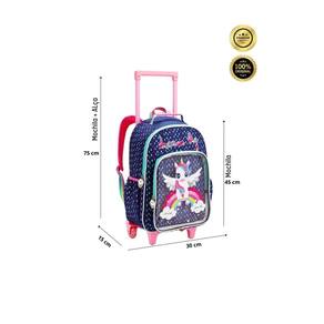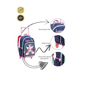 Mochila de Rodinha e Costas 2em1 Unicórnio Produzido em poliéster 1 divisão grande 2 bolsos laterais em redinha Alças acolchoadas de Costas Alça de carrinho com 02 rodinhas 1 bolso frontal Ziperes com puxadores personalizados Estampa estilizada Dimensões: 40 x 29 x 13 cm alt x larg x prof ; CUIDADOS: - Guarde em um local seco e arejado evitando locais úmidos. - Evite colocar excesso de peso no produto para não forçar os zíperes e costuras. - Proteja os objetos cortantes e/ou pontiagudos evitando o contato direto com o produto. - Evitar altas temperaturas. - Cores claras poderão manchar quando em contato com outros objetos ou roupas de cores pigmentadas.