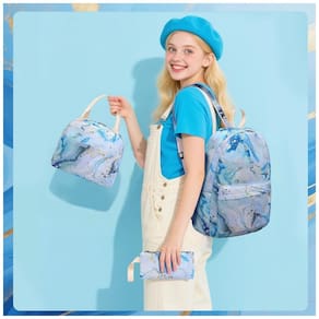 O material têxtil é macio e resistente, projetado para suportar uso frequente sem rasgos, com alças de ombro acolchoadas e ajustáveis que ajudam a reduzir a pressão nos ombros. A lancheira térmica com fechamento em zíper comporta recipientes, frutas e bebidas, enquanto o estojo acompanha o conjunto para organização de lápis, canetas e pequenos acessórios, mantendo um visual coordenado em azul e branco.