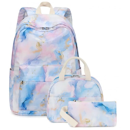 O tecido leve e resistente foi desenvolvido para suportar uso frequente, enquanto as alças de ombro acolchoadas e ajustáveis auxiliam na redução da pressão sobre os ombros. A lancheira térmica, com dimensões adequadas para marmitas, frutas e bebidas, possui interior isolado para manter os alimentos em boas condições, e o estojo acompanha o conjunto para organização de lápis, canetas e acessórios, mantendo visual coordenado no padrão marmorizado rosa, azul, roxo e dourado.