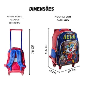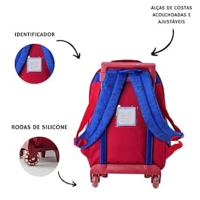 Mochila infantil com rodas de qualidade, ótimo espaço interno, com 2 divisórias e 2 bolsos laterais, com cursores dos zíperes personalizados, alças de ombros acolchoados e ajustáveis, 1 etiqueta de identificação da criança e alça de mão acolchoada.