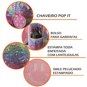 Seu design encantador é feito de lantejoulas e possui estampa Smile Peluciado, adicionando um toque mágico ao visual. Além disso, ela vem com um chaveiro Pop It, que é super divertido.
