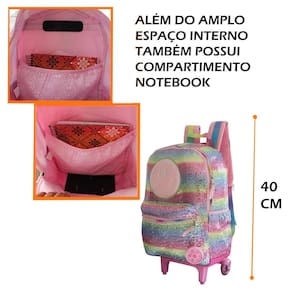 Essa mochila possui alça retrátil e rodinhas, facilitando o transporte e aliviando o peso nas costas. Além disso, conta com alça nas costas com regulagem de tamanho e alça superior para segurar na mão quando necessário.