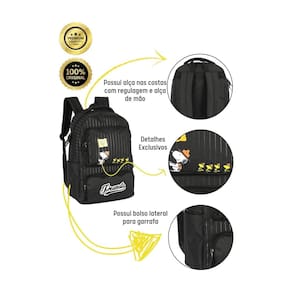 Confeccionada em Poliéster Alças de costas reguláveis e alça de mão Compartimentos espaçosos 2 bolsos laterais para garrafa Design exclusivo Fechamento em zíper Puxadores personalizados Medidas aproximadas: Altura: 45 cm Largura: 15 cm Comprimento: 30 cm CUIDADOS: - Guarde em um local seco e arejado evitando locais úmidos. - Evite colocar excesso de peso no produto para não forçar os zíperes e costuras. - Proteja os objetos cortantes e/ou pontiagudos evitando o contato direto com o produto. - Evitar altas temperaturas. - Cores claras poderão manchar quando em contato com outros objetos ou roupas de cores pigmentadas.
