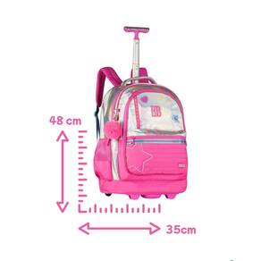 Características: - Alça de mão - Alça de costas acolchoadas e ajustáveis - Bolsos laterais telados - Forro interno rosa listrado - Compartimento de Laptop e Tablet - Mosquetão formato de coração - Chaveiro pompom, cadarço e estrela acrílico - Logo metalizado - Patches atoalhados - Puxador personalizado - Zíper tratorado - Proteção para rodas e alças - Estrutura do carrinho em alumínio