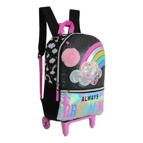DESCRIÇÃO DA MOCHILA: - Disponível nas cores; Preta e Roxa - Estampa de Arco Íris, confete metalizado e glitter. - Chaveiro de pompom. - Rodinhas de silicone. - Alça nas costas com regulagem de tamanho. - Alça superior para segurar na mão quando necessário. - Bolsos laterais. - Possui 2 bolsos, sendo um principal e o outro um pouco menor.