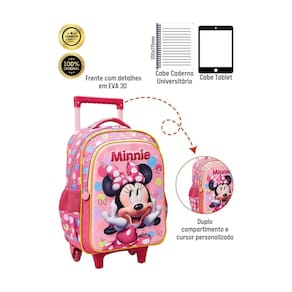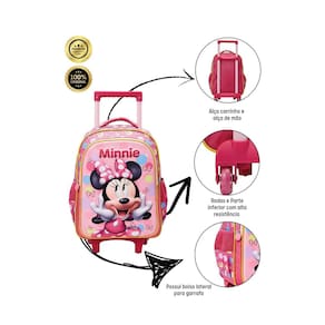 Mochila de Rodinhas da Minnie Magia e estilo para as pequenas princesas A mochila de rodinhas da Minnie com alto relevo é mais do que apenas um acessório escolar. É um convite para um mundo de encantamento e diversão, onde a imaginação não tem limites. Com design inspirado na icônica personagem da Disney, essa mochila é perfeita para meninas que adoram a Minnie e buscam um item funcional e estiloso para o dia a dia. Principais características: Rodinhas: Fortes e resistente facilitam o transporte, tornando o caminho para a escola mais leve e divertido. Alto relevo: Detalhes em alto relevo da Minnie que dão um toque especial à mochila. Duplo compartimento: Organiza os materiais escolares com mais praticidade. Bolsos laterais: Ideais para garrafinhas de água e outros pequenos objetos. Alças de mão e de puxar: Versatilidade para carregar a mochila da maneira mais confortável. Cursores personalizados: Um toque especial que encanta as pequenas fãs da Minnie. Material resistente: Garante durabilidade e acompanha a criança em todas as aventuras. Qualidade: Confeccionada com materiais duráveis, a mochila acompanha a criança por muito tempo. Ideal para: Meninas fãs da Minnie: Um presente perfeito para encantar as pequenas princesas. Dia a dia escolar: Organiza os materiais escolares e torna o caminho para a escola mais divertido. Viagens e passeios: Ideal para transportar brinquedos e lanches. Medidas: