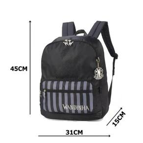 Mochila de Costas Oficial Wandinha Addams Preto A mochila de costas Wandinha Juvenil Luxcel é perfeita para as jovens que buscam estilo e praticidade. Feita em poliéster resistente, possui quatro bolsos para organizar seus pertences de forma prática. Seu fecho em zíper garante segurança e facilidade no acesso aos itens. Com um design detalhado e na cor preta, essa mochila é ideal para o uso escolar. Além disso, é reforçada, proporcionando durabilidade e conforto durante o uso. Não é à prova d'água, mas seu material resistente ajuda a proteger seus pertences em dias de chuva. A mochila Wandinha Juvenil Luxcel é a escolha perfeita para acompanhar as jovens em suas atividades diárias. Características da Mochila Escolar: - 2 Bolsos frontais com fechamento em zíper - Bolso lateral para squeeze - Alças e costas acolchoadas, alças ajustáveis - Alça de mão reforçada na parte superior - Puxadores personalizados - Chaveiro personalizado - Material: 100% Poliéster - Mochila com Glitter Dimensões da Mochila Escolar: Altura: 45 cm Largura: 31 cm Profundidade: 15 cm Conteúdo: - 1 Mochila