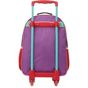 A mochila é confeccionada em poliéster resistente, com a frente em PVC com glitter envernizado, o que garante que o glitter não se descole. Possui zíper com puxadores em metal personalizado. Além disso, conta com um compartimento principal espaçoso, dois bolsos laterais em rede, alça de mão reforçada, hastes com travas e rodinhas de gel decoradas com glitter.