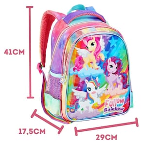 Design Encantador de Poney: A mochila exibe um tema adorável de poney, com orelhas e um rosto amigável que capturam a atenção das crianças. As cores vibrantes e os detalhes brilhantes adicionam um toque mágico ao material escolar, tornando a mochila um item irresistível.