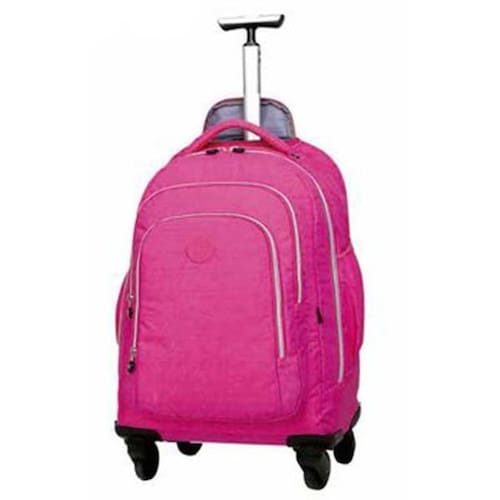 A mochila é feita em poliéster tactel, com design diferenciado, possui rodinhas 360 graus e puxador em forma de T com botão para regular a altura. Ela também pode ser nas costas, pois possui alças ajustáveis e macias que se Adaptam ao corpo.