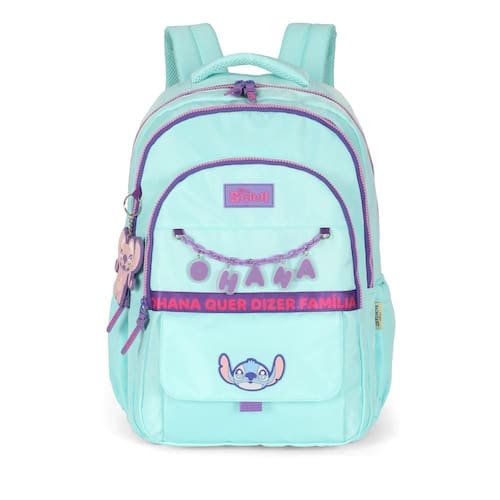 Compartimento acolchoado para notebook Amplo espaço interno com divisórias Bolsos frontais e laterais funcionais Alças ajustáveis e confortáveis Produto oficial e licenciado Disney Stitch
