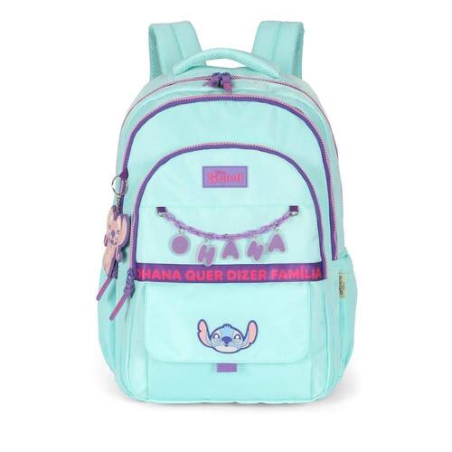 Compartimento acolchoado para notebook Amplo espaço interno com divisórias Bolsos frontais e laterais funcionais Alças ajustáveis e confortáveis Produto oficial e licenciado Disney Stitch
