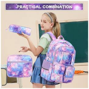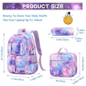 Conjunto escolar com mochila, lancheira e estojo em estampa galaxy, indicado para meninas de aproximadamente 6 a 14 anos em fase de ensino fundamental. A mochila mede cerca de 30 cm de largura, 18 cm de profundidade e 46 cm de altura, com compartimento principal equipado com sleeve para notebook de até 15", espaço para fichários A4, livros didáticos e lancheira, além de segundo bolso frontal para cadernos, estojo e materiais básicos.