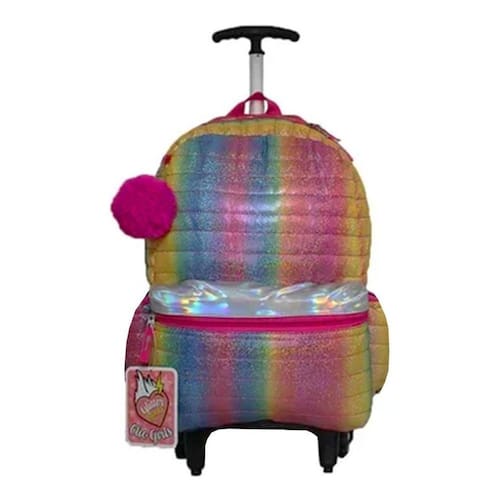 Mochila colorida de glitter, com espaço interno e bolso para maior organização e segurança na mochila. Ideal para trabalho, atividades diárias, lazer, etc..Observação: a mochila é enfeitada com glitterCaracterísticas da mochila:- são dois bolsos , sendo um principal onde coloca os livros, cadernos, apostilas, etc, e um outro bolso frontal menor para guardar itens menores.- resistente, confeccionada em poliéster- zíper duplo- acompanha pom pom rosa lindo.- alça reforçada e ajustável- enfeitada com glitter- costas e alça acolchoadas- bolso em fechamento com zíper- alça de mão reforçada- desenvolvida em um alto padrão de qualidade, para maior durabilidade do produto- ideal para quem precisa levar cadernos, pastas, livros e outros, pois não prejudica a coluna, além de que essa mochila de carrinhos facilita bastante o transporte do material.- rodinhas de silicone reforçado.Dimensões da mochila:Altura: 42 cmLargura: 30 cmProfundidade: 18 cmCapacidade: 22 litrosAltura da haste em relação ao nível do solo : 77 cm.Produto originalLicenciado pela clio style.