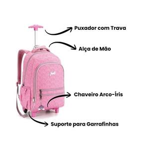 Descubra a Mochila Escolar Rodinhas e Alça de Costas Matelassê para Meninas, modelo reforçado e com design encantador em tom rosa com detalhes em arco-íris. Perfeita para o dia a dia escolar, essa mochila alia praticidade e conforto, garantindo organização e facilidade no transporte.