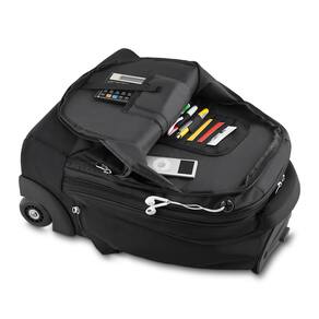 Mochila executiva com rodinha em poliéster com detalhe em couro sintético além de bolso frontal