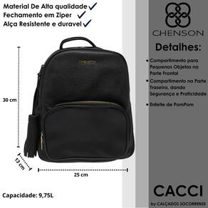 Clássica, elegante e funcional! A Mochila Feminina Chenson Linha Clássica é perfeita para quem busca estilo e praticidade no dia a dia. Feita em poliuretano de alta qualidade, possui acabamento refinado com costura contrastante, agregando charme e sofisticação ao design. Seu fechamento em ecler duplo garante mais segurança, enquanto o amplo espaço interno permite acomodar seus pertences com organização. O bolso frontal com fechamento em ecler oferece praticidade e facilidade de acesso aos itens menores. Suas alças em poliuretano são ajustáveis, proporcionando conforto durante o uso, e o forro em tecido personalizado agrega um toque de exclusividade ao interior da mochila. Leve sua rotina com mais estilo e funcionalidade! A Mochila Chenson Linha Clássica é a escolha ideal para quem não abre mão de elegância e praticidade.