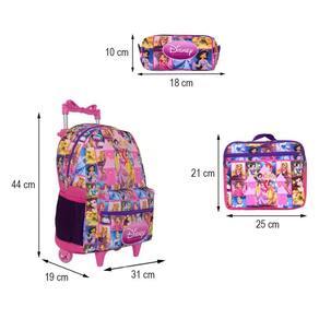 Kit Mochila Escolar Infantil Princesas Rodinhas, acompanha lancheira e estojo. Possui alça de mão reforçada. Agora você pode levar sua mochila no seu dia a dia ou acompanhar você na escola. Sua abertura maior se dá por zíper com puxador. Na parte de dentro possui amplo espaço para a guardar diversos materiais como cadernos, livros e estojos. Na parte da frente, possui bolso com zíper para a guardar pertences de menor tamanho e bolsos laterais.