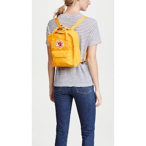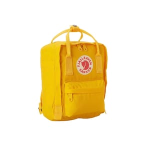 Mini mochila feminina Fjallraven Kanken, amarelo quente, tamanho único - Tecido: trama de nylon - Comprimento: 20,5 cm, Altura: 28 cm, Profundidade: 7,5 cm - Bolsos laterais e bolso frontal com zíper - Alças ajustáveis - Peso: 0,23 kg