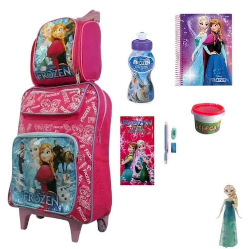 - mochila (g) da frozen com rodinha - lancheira - squeeze - caderno (1 matéria) - slime - kit 2 lápis grafite, borracha & apontador - toalha de mão - boneca pequena (podendo vir elsa ou ana)