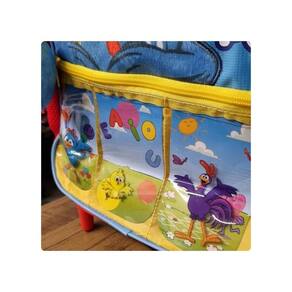 Confeccionada em cetim de alta qualidade, ela vem com rodinhas resistentes, puxador retrátil e alças acolchoadas para usar nas costas. E o melhor: acompanha livreto para colorir e personalizar, além de chaveiro com som e patch em pelúcia da galinha pintadinha
