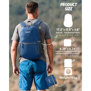Gonex Mochila ultraleve embalável, prática e dobrável, acampamento, viagem, ciclismo, mochila (azul escuro) - Companheiro para atividades ao ar livre: perfeita para uma variedade de ocasiões, como viagens aéreas, volta às aulas, acampamento de verão e compras - Adequado para adultos/estudantes: o desdobrado mede 44 x 30 x 15 cm e pesa apenas 185 g, o que a torna ideal para adultos, estudantes universitários e crianças (aviso, perigo de asfixia, peças pequenas não adequadas para crianças menores de 3 anos) - Conveniente e embalável: fácil de dobrar em um pequeno bolso (16 x 16 cm). Para que você possa guardá-la facilmente em sua mala para usar no destino como uma bolsa extra para a viagem - Mochila leve de qualidade: feita de material de nylon resistente à água e rasgos, zíper de metal SBS durável e resistente à abrasão disponível. Reforçada em mais de 25 lugares com processo de bartack - Mantenha as coisas organizadas: mochila de caminhada de 20 L com três compartimentos com zíper. um bolso principal espaçoso para seus itens essenciais, um bolso externo para itens de acesso rápido, como guias e câmeras, e um bolso interno seguro para objetos de valor como dinheiro, cartões e passaportes - Cor: Azul escuro, estável, misterioso, clássico