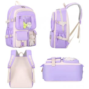 Conjunto escolar com cinco peças em estilo preppy kawaii, indicado para crianças e pré-adolescentes em idade escolar, para uso em sala de aula, biblioteca, atividades de dança, passeios e pequenas viagens. O kit inclui mochila principal, bolsa tiracolo, pequena bolsa de mão, saquinho tipo saco com cordão e estojo, todos com visual em blocos de cor e bolsos frontais transparentes para exibir itens decorativos e acessórios.