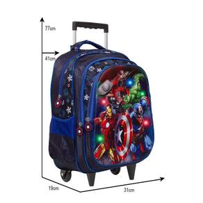 Mochila Escolar Infantil Vingadores Rodinhas possui alça de mão reforçada. Agora você pode levar sua mochila no seu dia a dia ou acompanhar você na escola. Sua abertura maior se dá por zíper com puxador. Na parte de dentro possui amplo espaço para a guardar diversos materiais como cadernos, livros e estojos. Na parte da frente, possui luzes de led que piscam na frente, tornando-a ainda mais divertida e atraente.