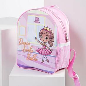 Mochila Infantil Princesa Bailarina Rosa Verniz Sublimada com Porta Garrafa e Bolso Colombina.