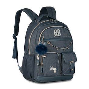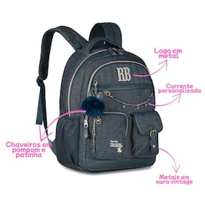 Características Mochila: - Alça de mão - Alça de costas - Alça carona - Bolso antifurto - Bolsos Laterais - Confeccionados em material jeans com Matelassê - Chaveiros pompom com orelhinhas, plaquinhas de metal e correntinha com strass em ouro velho - Logo RB em metal - Zíper tratorado com puxadores com cadarço - Compartimentos para laptop + tablet- Forro rossa listrado