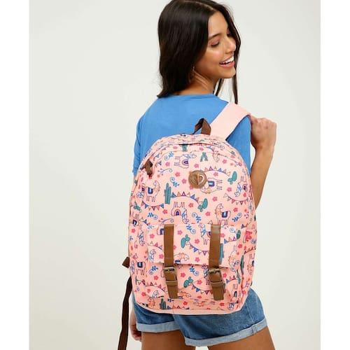 Mochila feminina confeccionada em tecido. Possui estampa lhama, fechamento por zíper, repartição única, forro, bolso lapela frontal com tira, alça de mão, alças traseiras ajustáveis, acabamento em costura no tom.