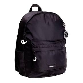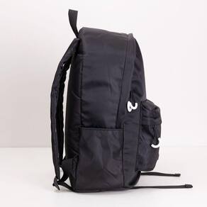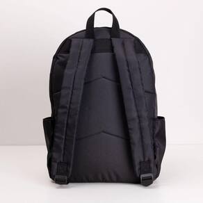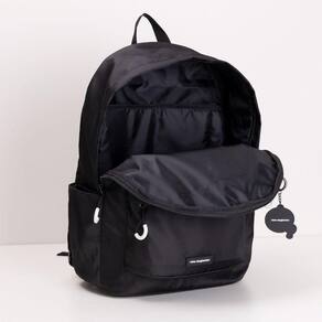 1 acessório divertido; zíperes com puxadores com detalhes em plástico e cordão; 1 alça de mão; 2 alças de ombro acolchoadas; 1 bolso frontal com abertura em zíper; 2 bolsos laterais; compartimento principal com abertura em zíper; compartimento interno para laptop de até 14 polegadas; tecido resistente à água.
