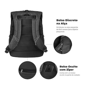 Muita gente, especialmente estudante, não guarda o notebook na bolsa por medo de ser roubada. Com a mochila locker, da gorila shield, esse temor está prestes a acabar o acessório possui um cadeado com senha de três dígitos que trava a abertura da mochila para mantê-la inviolável. Além do recurso de segurança, a locker também possui um bolso discreto na alça esquerda, ideal para guardar chaves, fones, pendrive e moedas. Na parte inferior da traseira há um bolso oculto onde o usuário pode colocar o celular, a carteira ou uma agenda. Tem ainda, em cada lado da mochila, um bolso com zíper. Para armazenar objetos maiores, como livros, revistas, tablets e kindles, há um bolso maior na parte da frente. Acima dele também existe um bolso menor perfeito para guardar lápis, caneta, carregadores e fones. Interior da mochila antes de passar para a parte interior, vale ressaltar que a locker possui duas repartições: uma em que o zíper vai até o meio da mochila e outra com abertura 180°. A primeira repartição possui um espaço amplo para colocar cadernos, livros, portfólio, kindle, tablet, revistas. Há também um compartimento específico para encaixar lápis e caneta, além de um bolso menor com tela. Na segunda repartição, com abertura de 180°, existe um compartimento feito especialmente para notebooks (de até 15.6 polegadas) e dois bolsos telados. Além, claro, de um vasto espaço para mais cadernos, livros, revistas e demais materiais de estudo/viagem. Para além dos compartimentos para objetos, a mochila locker tem uma entrada auxiliar p2 para plugar dispositivos via acesso interno e uma entrada de carregamento. Esta segunda funciona com o auxílio de um carregador portátil plugado através do interior da mochila. Com essa ferramenta o usuário pode carregar um aparelho pela entrada usb disponível na lateral da locker. Especificações peso: 1,2 kg tamanho: 51x30x15cm cor: preta ATENÇÃO: em um bolso interno, atrás das entradas de acesso p2 e usb, há um cabo p2 para conectar ao celular e um cabo usb para conectar ao carregador portátil imagens ilustrativas