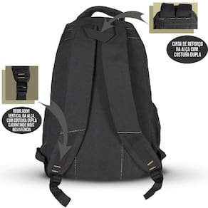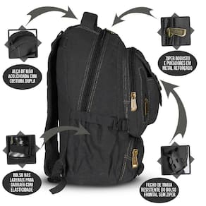 Interior da mochila todo forrado em náilon . Mochila Confecciona em Lona de alta qualidade ultra resistente. Material reforçado com Costuras duplas e Reforçadas. Alça de Mão e Costas Acolchoadas para maior conforto. Divisória Simples para Notebook. 1 Compartimento Grande Muito Espaçoso. 2 Compartimentos Frontais médios Com zíper. 2 compartimento frontais pequenos com zíper. 2 Bolsos Laterais Com elástico e Regulador. Alça de costas com costuras extras super reforçadas . Puxador do zíper em metais Resistente não quebra . Peso:750 g. Capacidade: 28 Litros. Material: 100% Lona Grossa.