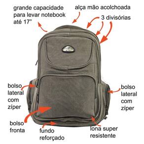 Mochila 100% lona com costas rígidas robusta de Eva com gomos massageadores. Segura o suficiente para proteger o seu equipamento e acessórios de acordo com o que você precisa levar As costas acolchoadas e com gomos rígidos de eva são perfeitas para proteger seu notebook de possíveis impactos da mochila durante o uso. Possui ainda divisórias e bolsos menores para cabos, tablet, bateria, telefone, tudo que você poderá precisar no seu trabalho, armazenado com segurança e organização. As alças são ajustáveis à sua altura e acolchoadas para maior conforto. Com design à prova de choque, esta mochila extremamente confortável é feita em lona grossa resistente e vem com sistema de zíperes super resistentes. Tem cinta peitoral para passar ao redor do peito, uma solução ideal para quem for caminhar longas distâncias, trilhas, etc. Tamanho em cm: 54x38x30