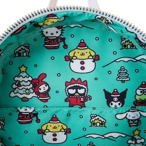 Loungefly Mini mochila Sanrio Winter Wonderland - Características: couro vegano (poliuretano), alças de ombro acolchoadas, ajustáveis, recortadas em wintergreen, bolsos laterais com arte de férias, compartimento principal com zíper, bolso oculto com zíper na frente, ferragens de metal prateado, apliques, relevo, bordado, glitter e detalhes impressos e forro interno combinado. - Dimensões: 22 cm L x 27 cm A x 11 cm P - Esta mochila é um produto oficialmente licenciado pela Sanrio.
