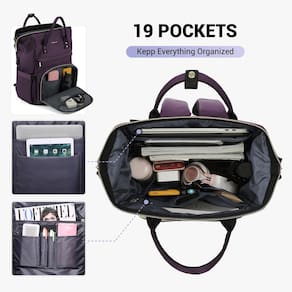 Esta mochila feminina elegante e prática para laptop é perfeita para profissionais, faculdades e viajantes. Possui um compartimento principal de ampla abertura que pode caber itens essenciais como pastas A4 e um laptop de até 17 polegadas, além de 18 bolsos organizados para fácil acesso a itens menores. Aprimorada com medidas de segurança, inclui um bolso oculto antirroubo e uma porta de carregamento USB (carregador portátil não incluído). O conforto é priorizado com alças de ombro grossas e uma alça de bagagem prática para facilitar a fixação da mala, tornando-a ideal para viagens de negócios ou uso diário. O design chique e o layout funcional fazem dela um excelente presente para mulheres que apreciam uma mistura de estilo e eficiência em seus acessórios. - Mochila feminina grande para laptop: possui um design de ampla abertura para acesso rápido e fácil. O compartimento principal é espaçoso o suficiente para guardar itens essenciais, como pastas A4, revistas e acessórios técnicos, tornando-o perfeito para o trabalho diário ou necessidades universitárias. A capa para laptop acomoda um laptop de até 17,3 polegadas. - Bem organizada: equipada com 18 bolsos, esta mochila feminina oferece armazenamento organizado para vários itens. O compartimento frontal é ideal para proteger itens menores e utilizados com frequência, como um laptop, artigos de papelaria ou itens essenciais, mantendo tudo organizado. - Mochila de viagem para laptop sem preocupações: possui um bolso oculto antirroubo para proteger itens valiosos como carteiras e telefones contra roubo. A porta de carregamento USB integrada permite que você carregue dispositivos eletrônicos em movimento, mantendo você conectado (carregador portátil não incluído). - Design conveniente: as alças de ombro são feitas com esponja grossa e tecido de malha respirável para reduzir a carga e aumentar o conforto. O design da alça de bagagem permite que a mochila seja facilmente montada em uma mala, tornando-a a companhia perfeita para viagens de negócios e viagens. - Multiuso: seja para profissionais, universitários ou viajantes de viagens curtas, esta mochila lovevook atende a várias necessidades. É especialmente adequada para profissões como professores e enfermeiros que precisam carregar muitos itens.