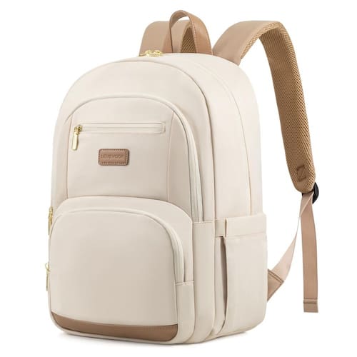 LOVEVOOK Mochila de viagem para laptop feminina, à prova d'água, mochila grande para computador para faculdade, Bege, Minimalista - Design de grande capacidade: esta mochila mede 42 x 33 x 20 cm, oferecendo amplo espaço de armazenamento. O compartimento principal tem um bolso para laptop de 15,6 polegadas e uma capa extra acolchoada para um tablet ou iPad, acomoda facilmente livros, arquivos comerciais e necessidades diárias para atender às suas várias necessidades - Alças e zíperes duráveis: Feito de tecido durável e à prova d'água; as alças de ombro e zíperes são finamente fabricados e reforçados para durabilidade e uso duradouro. Seja em viagens de viagem ou viagens de longa distância, pode fornecer desempenho confiável e conforto a longo prazo - Sistema de alívio das costas: para aliviar a carga dos ombros, a mochila é equipada com alças de ombro espessas; respiráveis e ajustáveis, garantindo que você experimente um grande conforto mesmo ao carregar cargas pesadas, reduzindo a pressão do transporte prolongado - Alças de bagagem convenientes: as alças de bagagem são projetadas na parte de trás da mochila, que podem ser facilmente fixadas na mala do carrinho, proporcionando uma experiência de viagem perfeita e conveniente, permitindo que você fique limpo, arrumado, simples e fácil onde quer que você vá - Usos versáteis: seja usada como mochila universitária, mochila de trabalho de negócios ou mochila de viagem casual, o design simplista e elegante desta mochila combina perfeitamente com qualquer ocasião, tornando-a a escolha ideal para homens e mulheres. Também é o presente perfeito para amigos e familiares