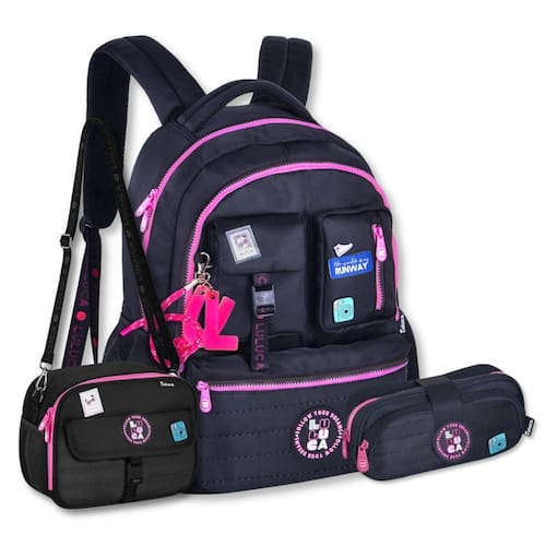 Mochila de Costas Luluca LU24636 + Lancheira Térmica LU24637 + Estojo Duplo LU24641 Este kit é muito mais que acessórios escolares: é uma combinação perfeita de estilo, conforto e organização Ela se destaca pelos detalhes modernos que encantam meninas e adolescentes que adoram estar na moda. A Mochila Luluca LU24636 é perfeita para quem busca estilo e funcionalidade no dia a dia Disponível em 3 cores incríveis e modernas - rosa, preta ou azul - esta mochila combina tendência e praticidade. Seu compartimento principal espaçoso, com área acolchoada para notebook e tablet, garante a segurança dos seus dispositivos. Além disso, conta com mais um compartimento maior com fechamento por zíper e divisórias, ideais para manter seus pertences bem organizados. Para quem precisa de ainda mais praticidade, a mochila oferece 3 bolsos frontais com design moderno, além de um bolso antifurto traseiro para itens importantes. As laterais possuem bolsos telados, perfeitos para garrafinhas ou acessórios. Seu conforto é garantido pelas opções de alças: alça de costas ajustável e acolchoada, alça superior de mão reforçada e alça carona, ideal para acoplar à mala em viagens. O toque final fica por conta do chaveiro exclusivo de corda e acrílico, que traz um charme único ao modelo. Dimensões aproximadas: 44x33x15 cm Lancheira Térmica LU24637 Praticidade e charme em uma peça. Essa lancheira térmica possui compartimento principal espaçoso, bolso frontal e bolso lateral telado. Com zíper bicolor, cadarços logados acetinados, pins de metal e etiqueta de borracha, ela é ideal para manter seus lanches sempre frescos. Dimensões aproximadas: 19x24x12 cm. Estojo LU24641 Com design compacto e funcional, o estojo possui dois compartimentos com fechamento por zíper, permitindo organizar seus materiais com facilidade. Os detalhes incluem pin de metal e puxador de zíper personalizado, garantindo estilo e durabilidade. Dimensões aproximadas: 11x20x05 cm Confeccionadas em nylon com matelassê, cadarços acetinados, alfinetes de metal, etiqueta de borracha e zíper bicolor.