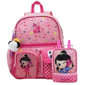 Descrição da mochila: - alças acolchoadas e ajustáveis. - alça de mão. - dois bolsos laterais, sendo um com zíper e o outro para garrafa. - zíper duplo personalizado. - compartimento principal com amplo espaço interno para livros, cadernos e materiais escolares. - bolso pequeno na frente com fecho engate de ímã. - bolso pequeno na frente interativo com cartões para mudar a cor da roupa da luluca. - chaveiro com xuxinha de cabelo;